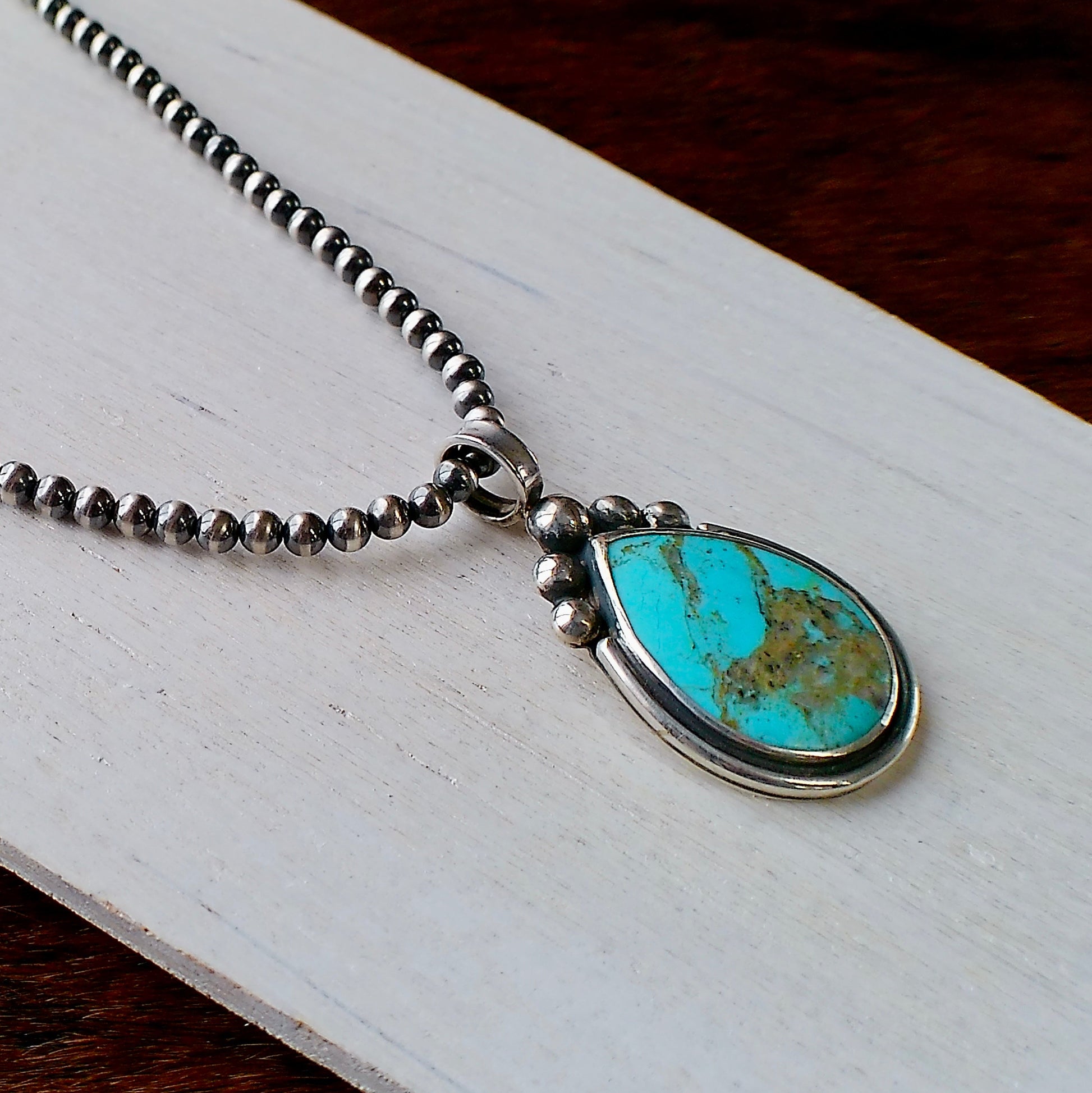 This handcrafted pendant features a striking teardrop of genuine turquoise, naturally veined and artistically divided by a sterling silver line. The generous bail fits comfortably over 6mm Navajo pearls, making it a versatile centrepiece for your favourite strand.